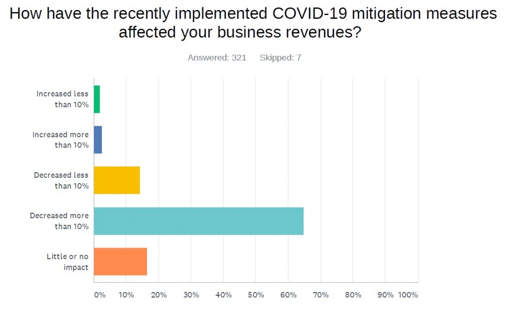 - A total of 64.5% of the employers who completed the survey reported an immediate decrease in business revenues by more than 10%. (See below)