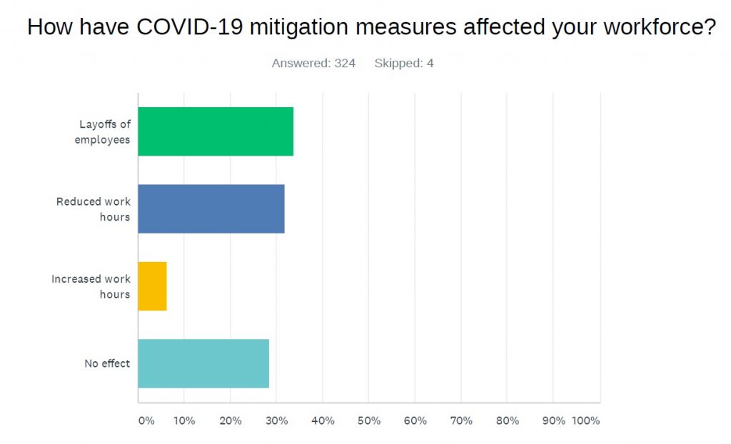 - When asked how mitigation efforts have affected their workforce, 33.6% of employers reported that the COVID-19 pandemic has resulted in layoffs. 32% reported a reduction in work hours, while 28.4% answered there had been no effect on the workforce. (See below)