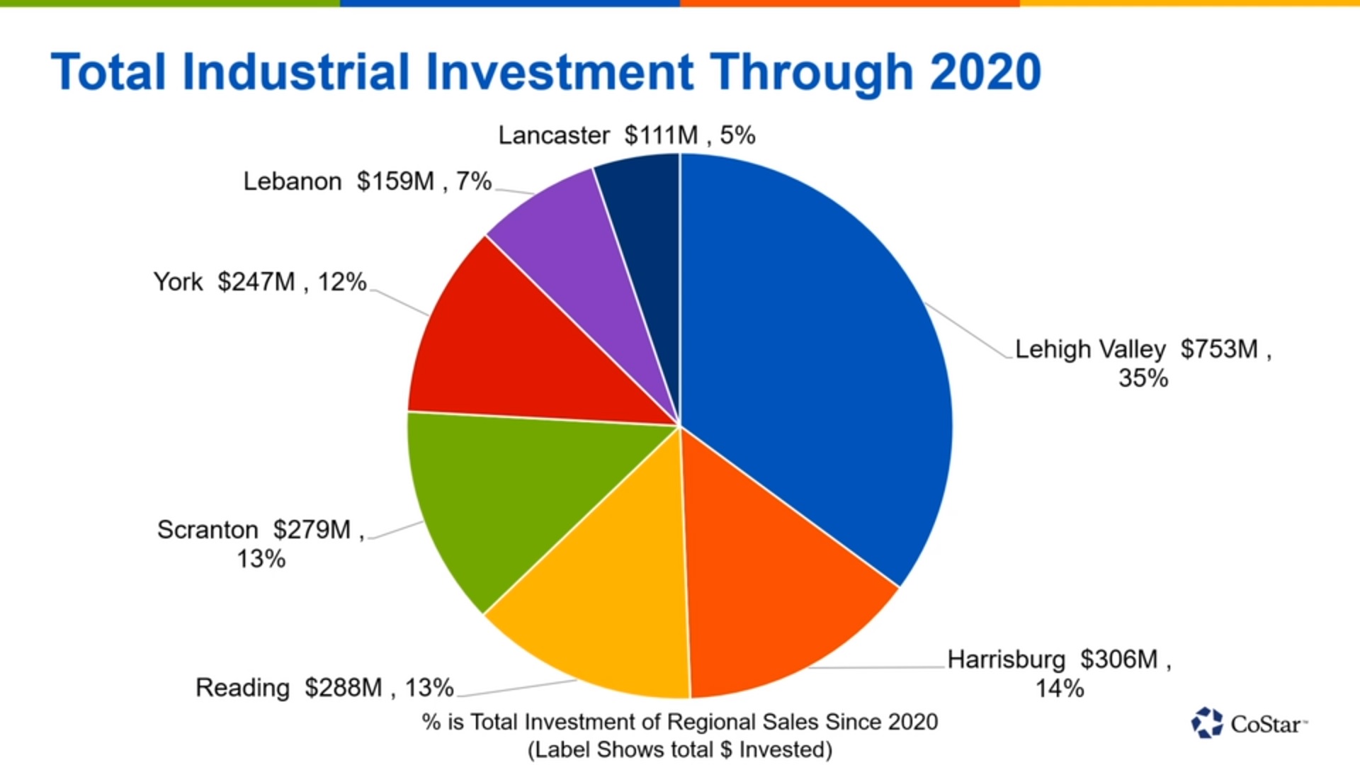 More than $750 million was spent on industrial investment in the Lehigh Valley through 2020, accounted for 35% of all industrial investment activity across the seven markets in northeastern and central Pennsylvania. (image courtesy CoStar)Pennsylvania’s seven industrial markets contained within the North Atlantic Trade Corridor performed well over the course of 2020, and the Lehigh Valley topped them all, according to the commercial real estate research organization CoStar.
