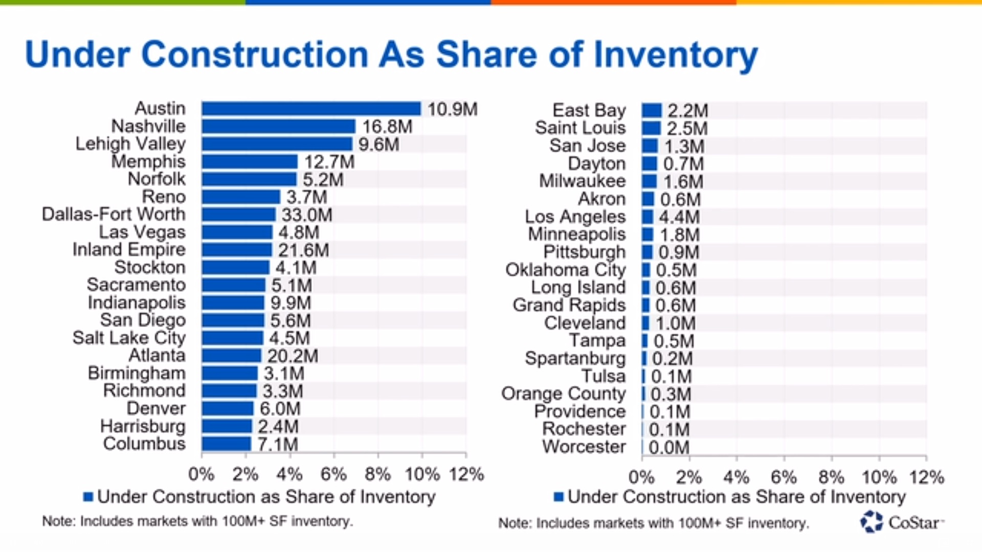 Corbett said relatively smaller markets around the country with fast-growing populations and labor markets are witnessing the highest rates of current under construction activity at over 6% of existing inventory. She specifically cited the markets of Austin, Texas; Nashville, Tenn.; and the Lehigh Valley.