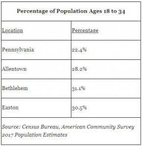In that same period, the Lehigh Valley’s population between the ages of 18 and 34 grew by 5.1 percent. In addition, the Lehigh Valley’s three cities – Allentown, Bethlehem and Easton – each have a considerably higher percentage of residents aged 18 to 34 than Pennsylvania overall.Growth in that key demographic group is significant for a couple of reasons. It shows employers that they can draw from a pool of available talent that has recently entered or soon will enter the Lehigh Valley’s workforce. It also demonstrates that the Lehigh Valley is successfully attracting the new talent that employers need as they expand, and as existing workers retire.