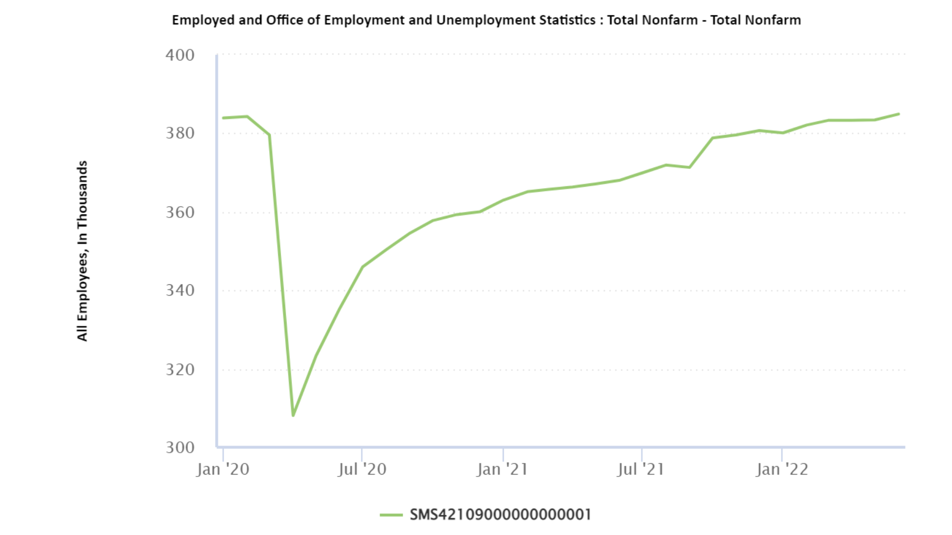 Job growth stalled this spring at 383,300, about 1,000 fewer jobs than February 2020. That changed in June when jobs picked up in a meaningful way. Preliminary data now puts employment at 600 jobs higher than it was in February 2020.