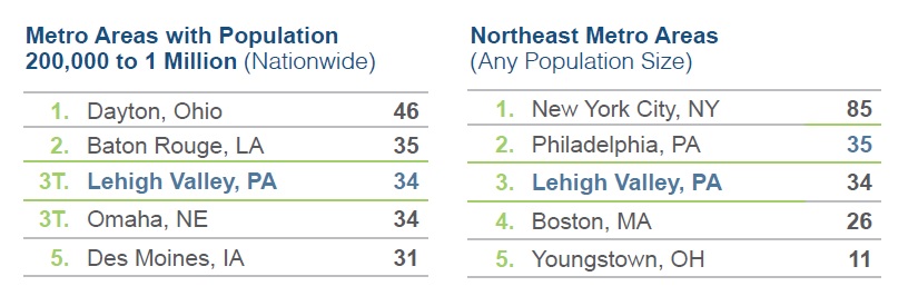 “Lehigh Valley's 34 capital investment projects for the year made it third in our tally of all Northeast metros, ahead of Pittsburgh and other larger cities," said Mark Arend, Editor in Chief of Site Selection. "This clearly demonstrates to our readers that the Lehigh Valley has the location attributes they require when siting new facilities.”