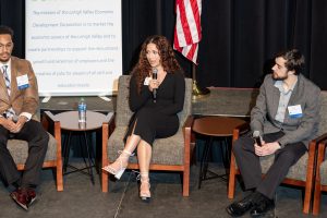 ArtsQuest CEO Kassie Hilgert, an outgoing LVEDC board member, facilitated a conversation about talent, a key driver of company location decisions. Employers are looking for growing communities that provide access the skilled workforce they need to be successful.Hilgert interviewed four people who followed their career aspirations to the Lehigh Valley. The panelists included: