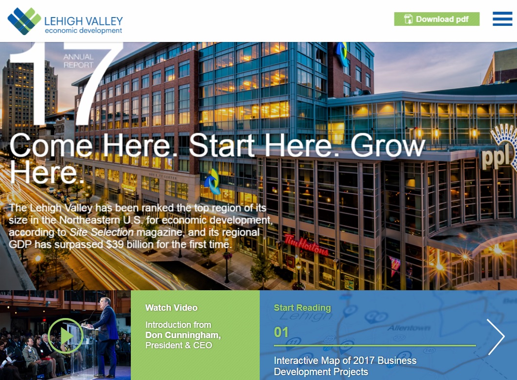A screenshot of the digital microsite of the 2017 LVEDC Annual Report. Additionally, LVEDC has released a digital microsite of the 2017 annual report, which in addition to the annual report content includes an interactive map of the 31 major Lehigh Valley economic development projects LVEDC worked on in 2017.