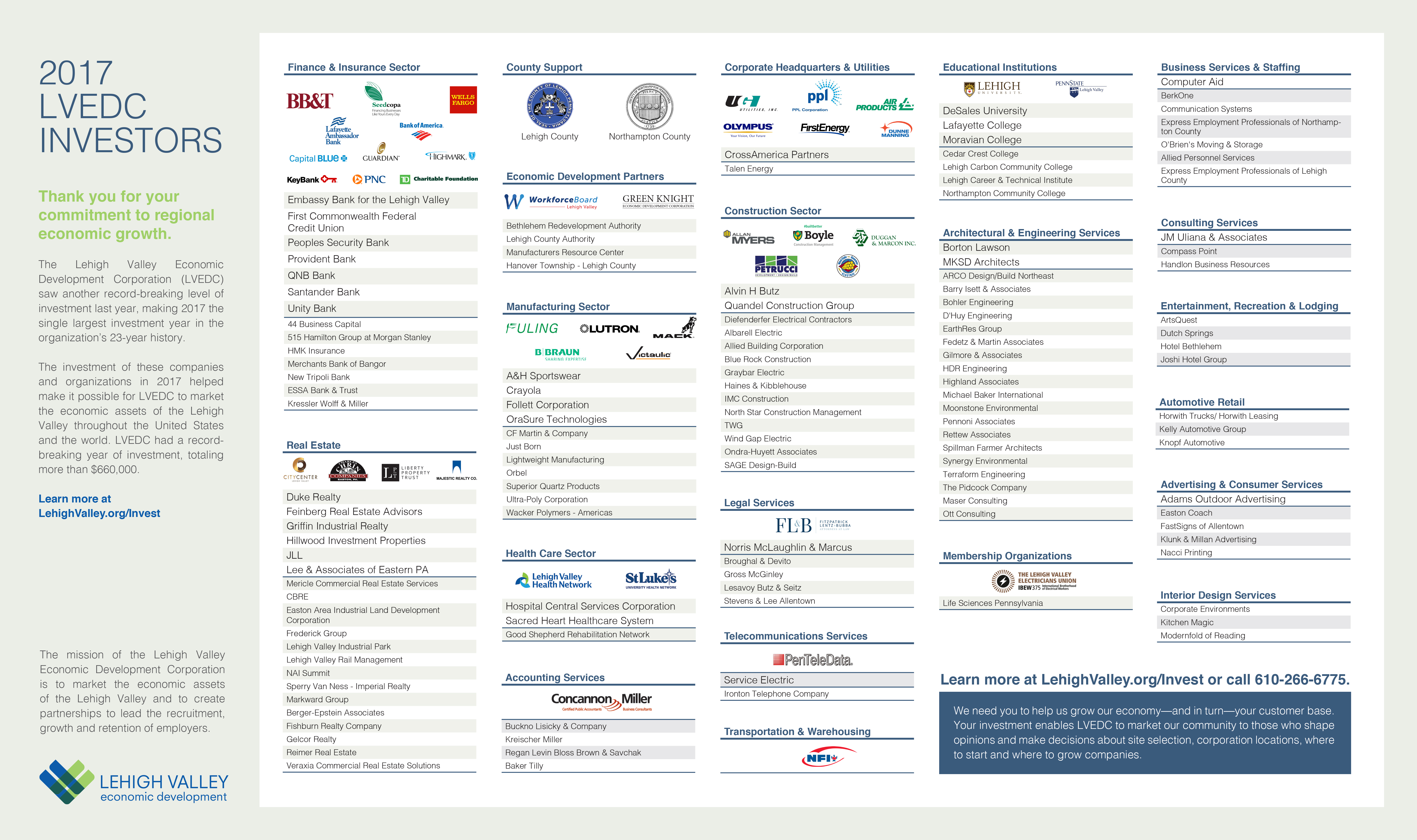 One of the newspaper advertisements LVEDC placed thanking investors for a record-breaking year. Click the image to enlarge. The Lehigh Valley Economic Development Corporation (LVEDC) experienced the single largest investment year in the organization's 23-year history in 2017, and we're making sure our investors know how appreciative we are.
