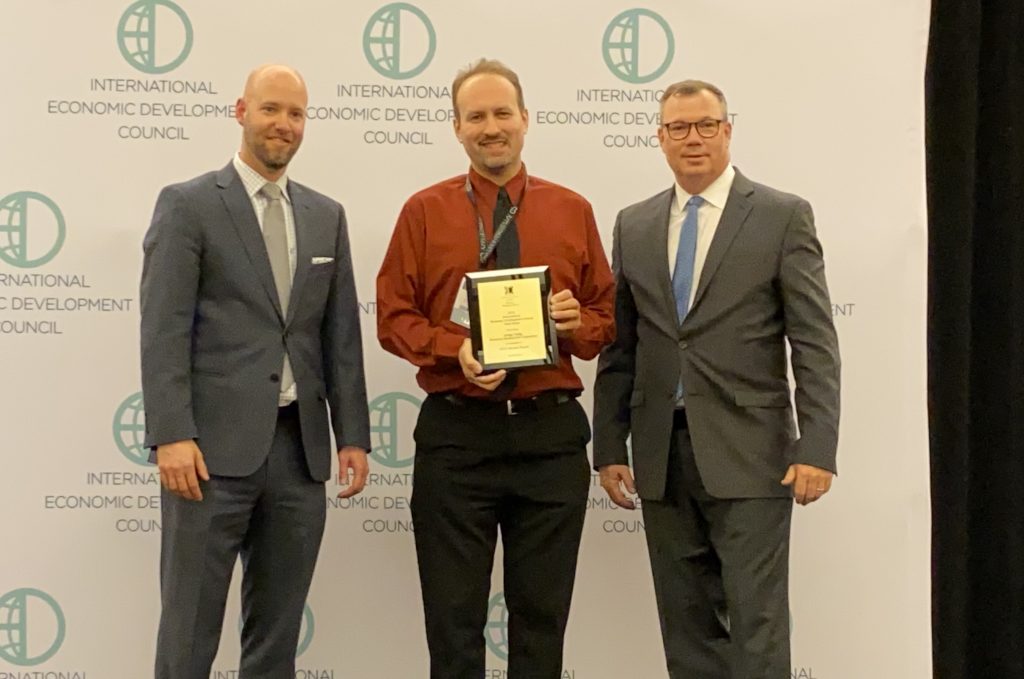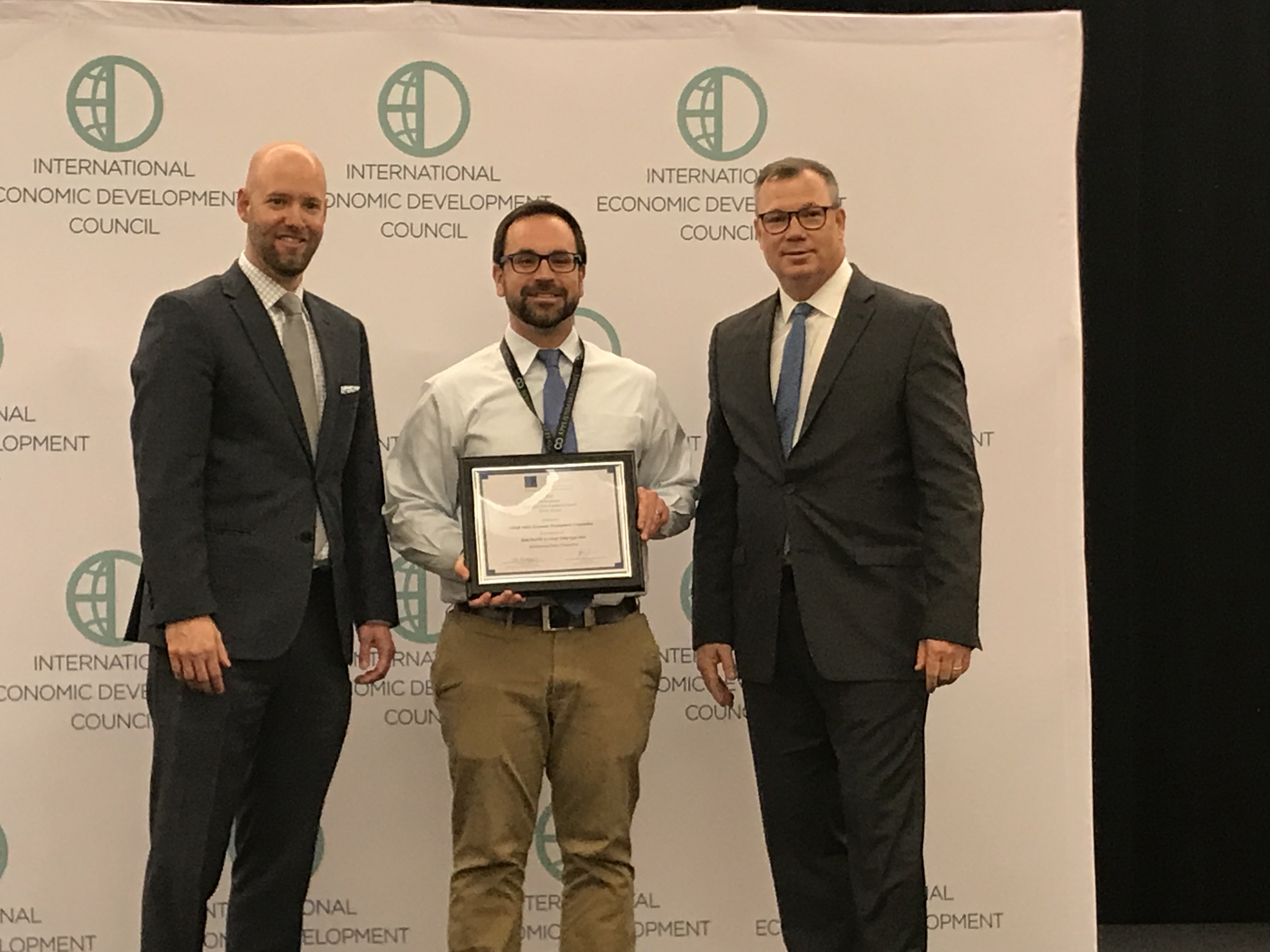 LVEDC Director of Communications Colin McEvoy (center) accepting an Excellence in Economic Development Gold Award for the LVEDC 2018 Annual Report. The Lehigh Valley Economic Development Corporation (LVEDC) has received two awards from the world’s largest and most prestigious organization serving economic developers.