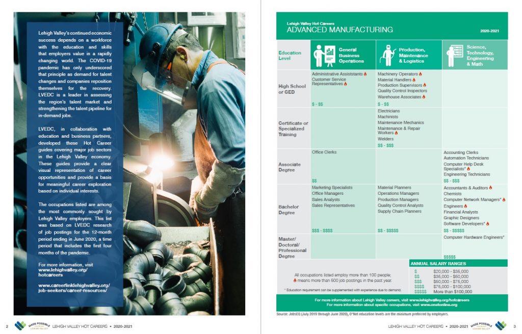 Sample pages from the Lehigh Valley Hot Careers Guide.The COVID-19 crisis has done nothing to change the fact that Lehigh Valley’s continued economic success depends on a workforce with the education and skills that employers value in a rapidly changing world. In fact, the pandemic has only underscored that principle as demand for talent changes and companies reposition themselves for the recovery.
