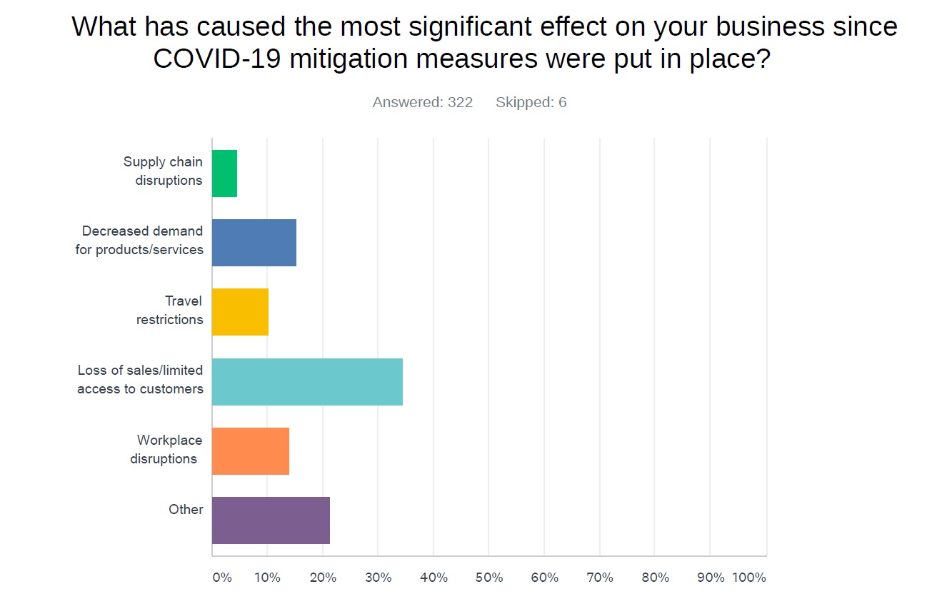 - 34.5% of employers surveyed reported the loss of sales as the single most significant impact of the pandemic. 15.2% of respondents said it was a decreased demand for services, and 14% said it was workplace disruptions. (See below)