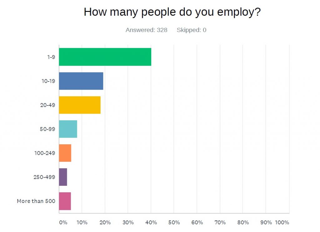- A majority of employers (40.2%) who participated in the survey have 1-9 employees. This is reflective of the regional economy as a whole; according to the U.S. Census Bureau, 67% of the more than 15,000 businesses in Lehigh and Northampton counties have fewer than 10 employees. (See below)