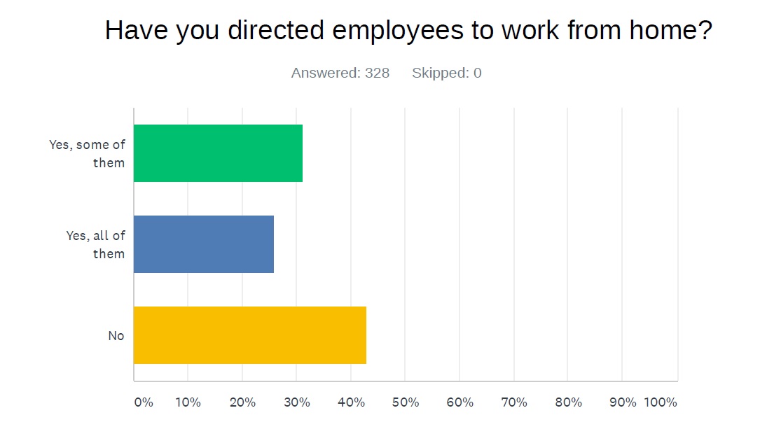 - A total of 57% of respondents have directed some or all of their employees to work from home; 43% of respondents have not, at least initially. (See below)