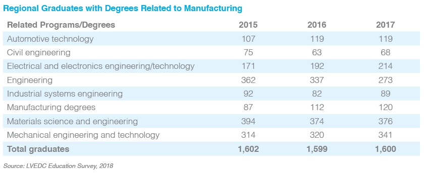 Overview: Manufacturing is the second-largest economic sector in the Lehigh Valley, contributing $6.89 billion toward the region’s $39.1 billion gross domestic product, or nearly 18 percent of the total regional GDP. According to the National Science and Technology Council, manufacturing has the greatest economic multiplier of any other sector, creating four additional jobs for every one job in manufacturing. The impact of manufacturing is expected to grow with the development of new technology and processes, which will require a large number of highly skilled workers. Nationally, a projected 3.5 million new manufacturing jobs are expected to be created in the next decade, with 2 million of those positions remaining unfilled due to a skills gap.