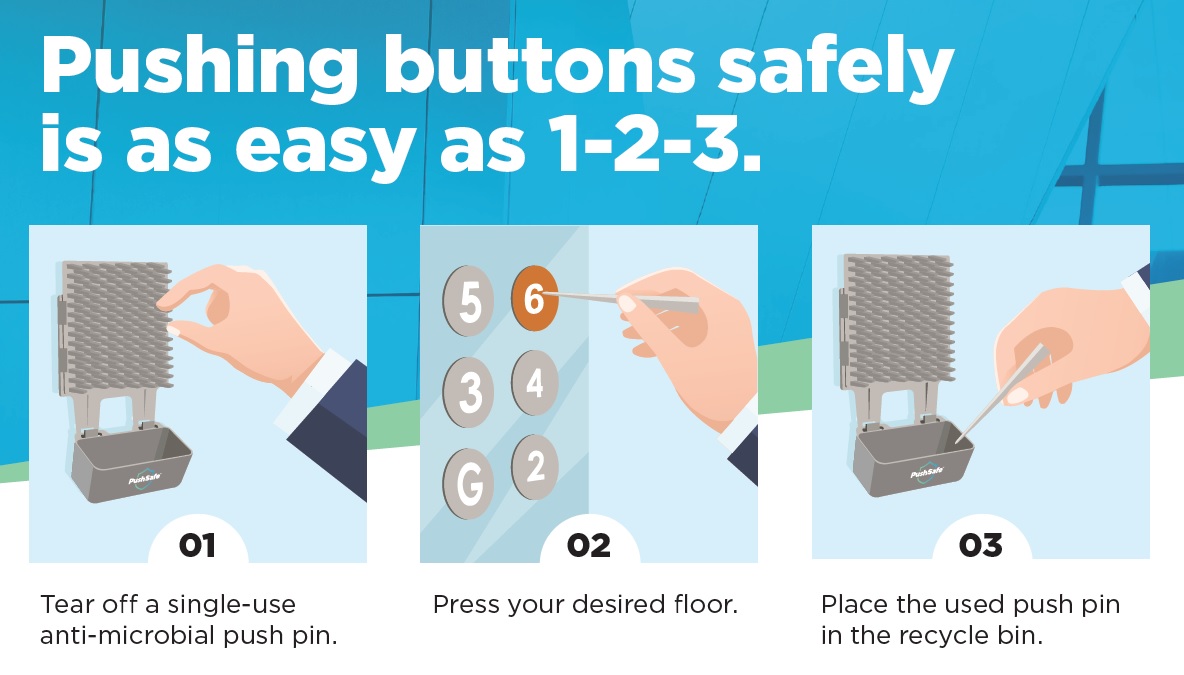 PushSafe pins are pulled off a plate, which holds 105 per plate. The plate slides into a bracket hung on the elevator with foam tape provided in each kit. (image provided by Tyson Daniels)These single-use hygienic push pins can be used to press elevator buttons without spreading germs. Made from a medical grade polymer with anti-microbial agent, Tyson and his partners, envisioned these recyclable pins in use at hospitals, apartment complexes, convention centers and anywhere else facilities facility management companies are seeking ways to make their occupants and visitors feel safer during the COVID-19 crisis.