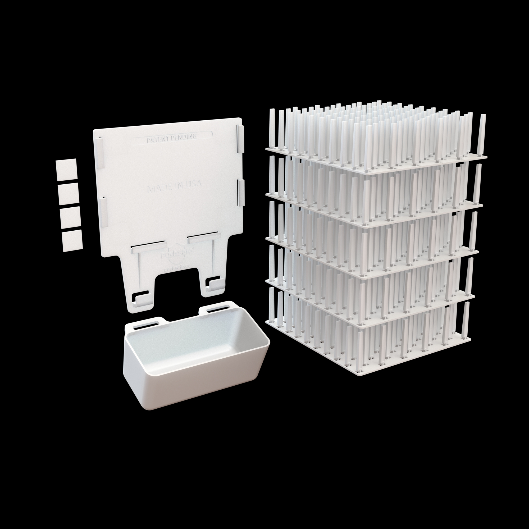 The pins are pulled off a plate, which holds 105 per plate, Daniels said. The plate slides into a bracket hung on the elevator with foam tape provided in each kit, and the pins are placed in a bin at the bottom of the bracket. Once the pins are all used, the plate can be easily replaced.