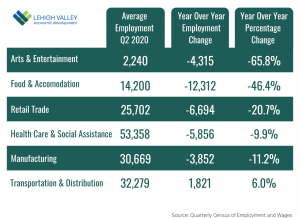 Every major industrial sector lost employment during the second quarter of 2020 but the Transportation and Distribution sector. (Graphic/Liz Martin)The number of new jobs in that sector reinforces Atwood’s optimism. While initially hit by the fallout from the COVID-induced recession this spring, employment in the transportation and distribution sector was the only one in Lehigh Valley to recover its employment by June. The average second-quarter employment was 32,279 in Lehigh and Northampton counties – about 6% more than the previous year, according to the Quarterly Census of Employment and Wages.
