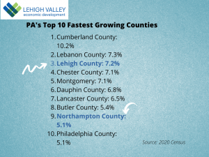 The U.S. Census released a list of the fastest growing counties in Pennsylvania. Lehigh Valley is among the top 10.Lehigh Valley’s population growth is driven by migration, previous population estimates show. Northampton County’s actually experienced more deaths than births but grew despite that because of the number of people moving into Lehigh Valley.