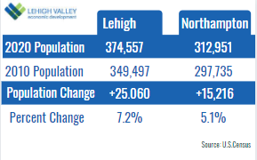 Lehigh County grew by 7.2% and Northampton County by 5.1% since 2020, according to the 2020 Census.Lehigh Valley’s population increase coincides with the growth of its diverse economy. The balanced economy includes advanced manufacturers, including those in life sciences, that have pushed Lehigh Valley to become the nation’s 52nd largest manufacturing economy and to be among the nation’s busiest industrial markets. The region’s largest employers are in the health care industry, and two Fortune 500 companies call Lehigh Valley home.