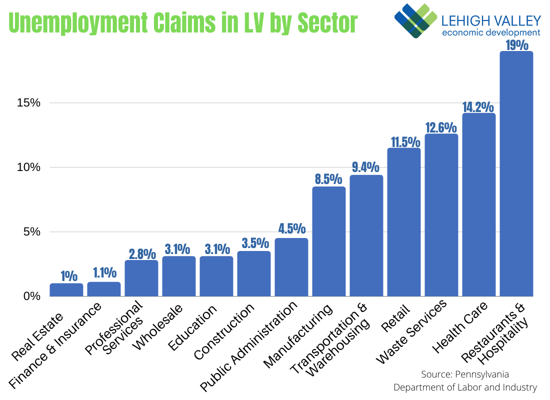 Health care and social services, a big Lehigh Valley employment sector, comprises 18.2% of the regional work force and its share of the unemployment claims filed by residents is 14.2%.