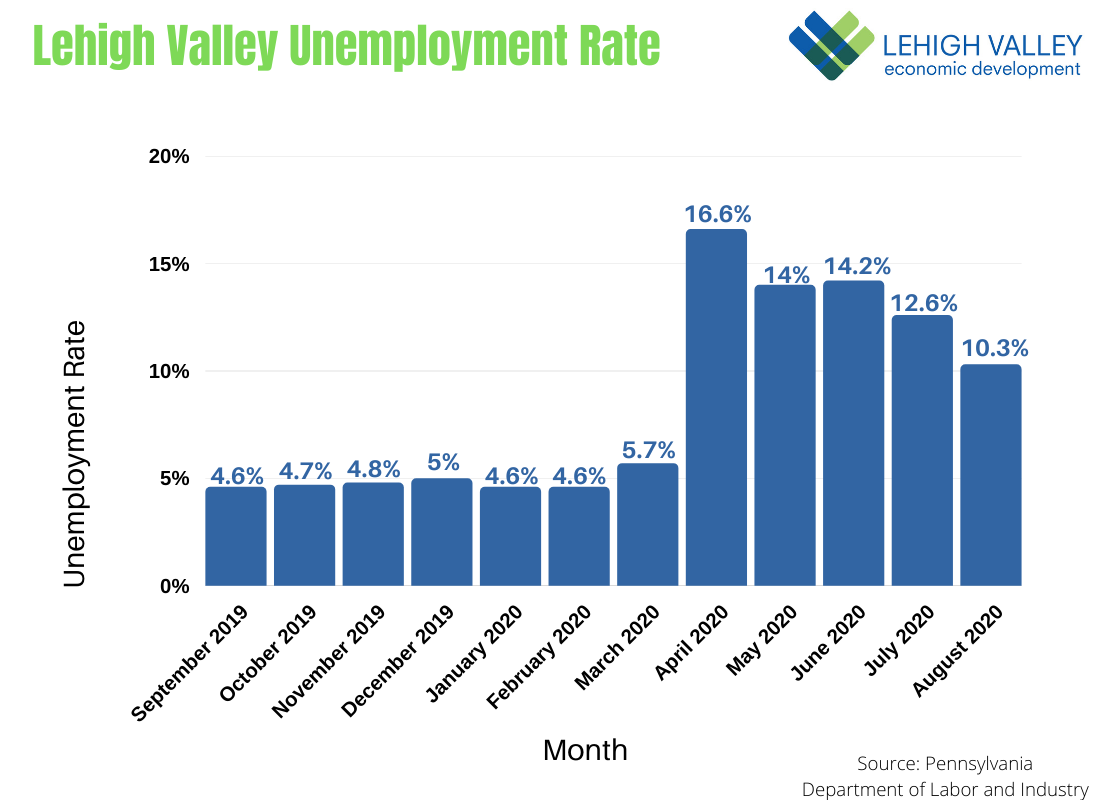 The August unemployment rate for Lehigh Valley dropped by 2.3 percentage points to 10.3%, two-thirds what it was in April but still twice the rate since COVID launched an otherwise strong economy into a recession, according to preliminary data reported by the Pennsylvania Department of Labor and Industry.