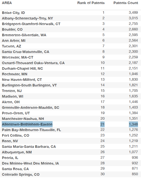 The Lehigh Valley ranks 21st out of 163 similarly-sized regions for patents awarded. Click the image above to enlarge.The Lehigh Valley ranks 61st out of 358 metropolitan statistical areas of any population size in the U.S., according to the analysis. Silicon Valley leads the list with 44,746 patents, followed by New York City with 30,562.