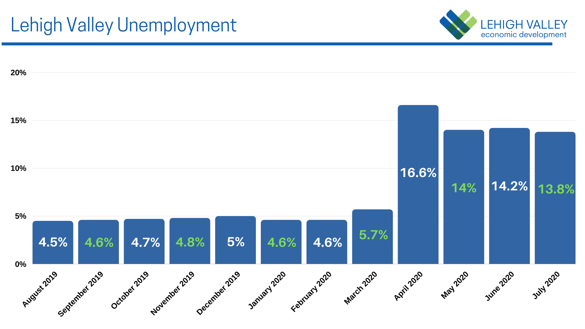 Lehigh Valley’s unemployment rate in July slid nearly a half percent, new state data shows. (Graphic/Liz Martin)Lehigh Valley’s unemployment rate in July slid nearly a half percent to 13.8%, a modest drop suggesting that the economic recovery could be gradual even as thousands of jobs are added to the regional payroll, new state data shows.