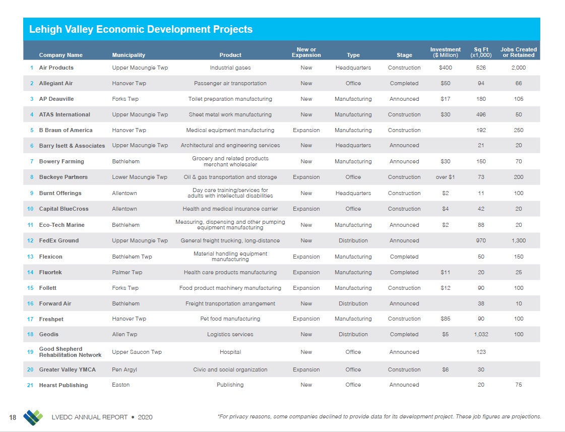 A map and table highlighting the 41 major development or expansion projects tracked by the Lehigh Valley Economic Development Corporation (LVEDC) was featured in the organization’s new 2020 Annual Report, which was released last month.