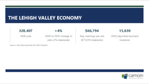 While the COVID-19 pandemic disrupted employment over the last two years, the talent study shows that Lehigh Valley is emerging from the recession in a competitive position. Employment, which was at 328,407 in 2020, is expected grow by 4% through 2025, faster than Pennsylvania’s 2% rate, according to Camoin Senior Vice President Jim Damicis. Meanwhile, the average earnings per job is $66,800 – about $4,200 less than statewide earnings, he said“You’re a high-performing region. When you think about today’s economic situation, plus 4% of projected growth is really good,” Damicis said. “You have lower than average earnings per job statewide. It’s not dramatically lower, [but] it provides a competitive advantage in terms of wages compared to some of the other high-cost markets.”