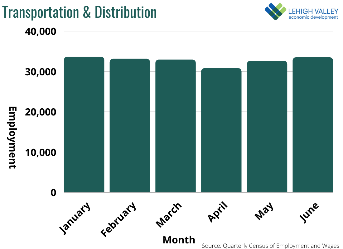 Employment in the Transportation and Distribution sector initially dropped but recovered to pre-pandemic levels by June. (Graphic/Liz Martin)While spurring e-commerce employment, the pandemic had a negative effect at bricks-and-mortar retail stores as consumers reduced their shopping trips. Not all retailers felt the pain equally. The employment at grocery stores was somewhat steady at 7,625, losing 20 jobs year over year. Beer, wine and liquor stores added a dozen, bringing the total employment to 518. Clothing, shoes and jewelry stores took among the biggest hits with employment falling to 728, a 69% drop.