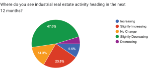 About half of the commercial real estate professionals who responded to a recent LVEDC survey expect activity to decrease in 2023.About half of the 21 respondents to the unscientific survey expect industrial and office real estate activity to decrease in 2023, while half see it increasing or staying the same. Those perceptions are backed by comments from respondents related to the higher cost of borrowing and the impact of inflation on the cost of construction materials.