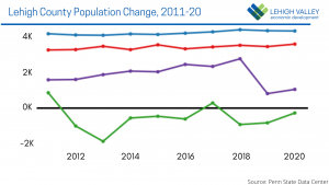 National demographic trends show the population is increasing at its slowest rate since the Great Depression. Lehigh Valley includes two of just 20 Pennsylvania counties that have increased in population over the last decade.