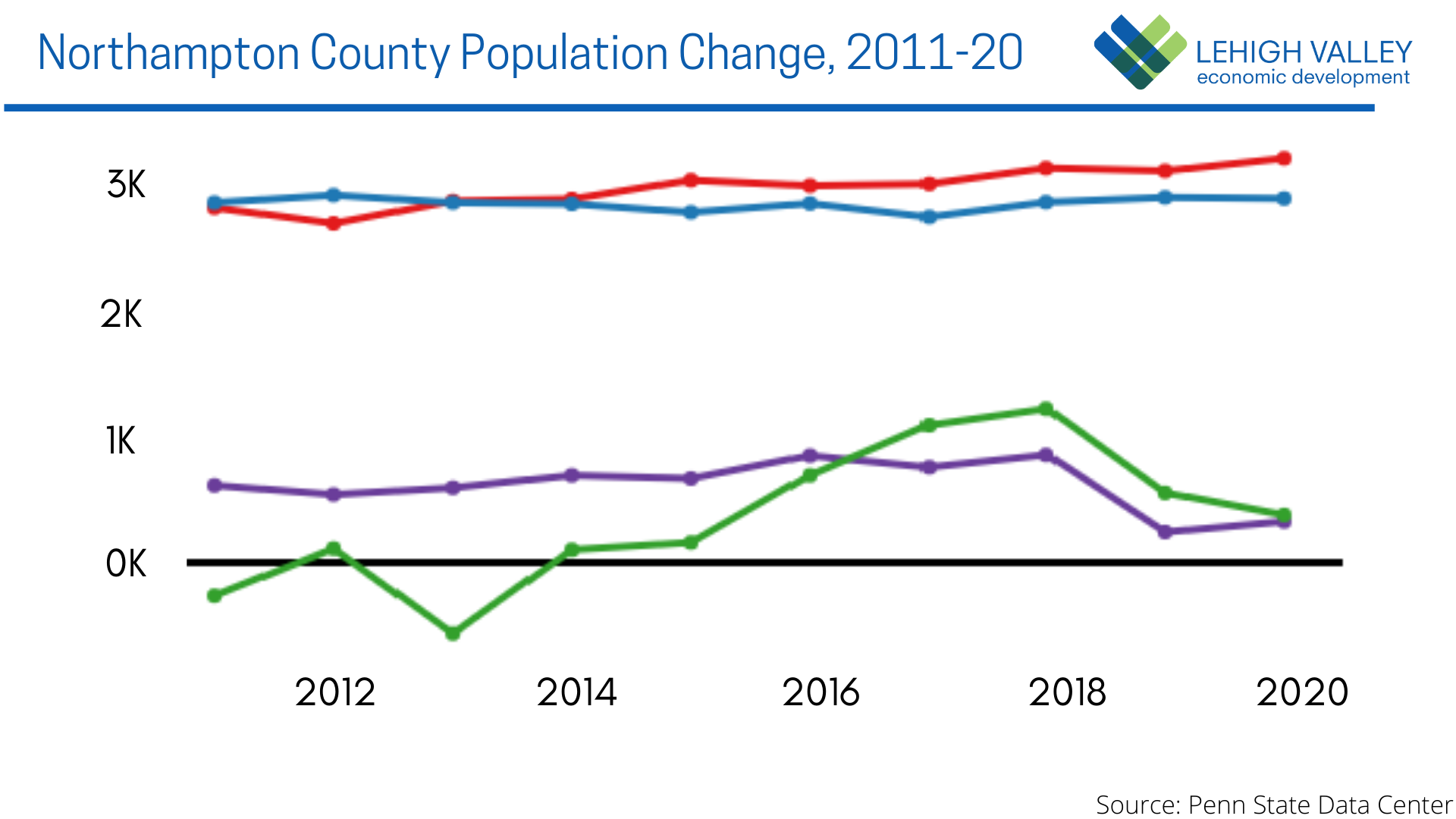 The chart, from the Penn State Data Center, shows the components of population change from 2011-2020 in Northampton County. The blue line denotes the number of births, red deaths, green domestic migration and purple international migration.Lehigh Valley is among the most desirable locations in the country for remote work because of its property values, green space and low crime rates, according to Ownerly, which produces real estate analytics.