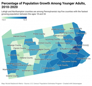 Lehigh Valley has a notable advantage as the economy emerges from the pandemic and companies rethink how and where to do business: young adults.Lehigh Valley's population between the ages of 18 and 34 grew by 10.7% over the last decade, a faster rate than every other region in Pennsylvania. Lehigh County led the state's 67 counties at 12.3% growth and Northampton County came in fourth at 8.8%, according to Lehigh Valley Economic Development Corporation (LVEDC) analysis of new population estimates released by the U.S. Census Bureau.