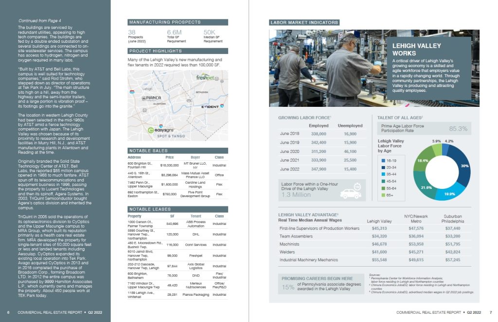 Pages from the Q2 issue of the Lehigh Valley Commercial Real Estate Report.The Lehigh Valley’s hot industrial properties continued to drive the region's commercial real estate market, putting it on pace to match 2021’s record-breaking growth.