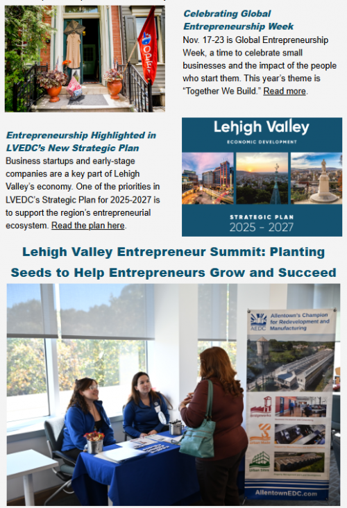 The newsletter notes that Global Entrepreneurship Week will be held Nov. 17-23, with the theme “Together We Build.” And the newsletter explains that one of the priorities in Lehigh Valley Economic Development Corporation’s (LVEDC) new Strategic Plan for 2025-2027 is to support the region’s entrepreneurial ecosystem.