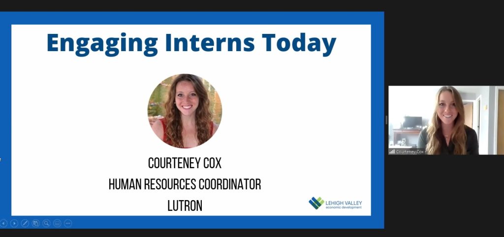 Courteney Cox, Human Resources Coordinator at Lutron, speaking at the Lehigh Valley Internship Summit, which was held virtually on Zoom.For a third consecutive year, the Lehigh Valley Economic Development Corporation (LVEDC) hosted the Lehigh Valley Internship Summit, providing businesses important information about how to establish and expand successful internship programs, connect with local colleges and universities, and attract the interns that will become their talent of tomorrow.