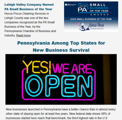 The newsletter also highlights how a Lehigh Valley company, Hocus Pocus Cleaning Services, was named PA Small Business of the Year, by the Pennsylvania Chamber of Business and Industry.