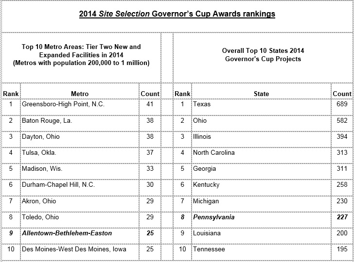 For the seventh consecutive year, Site Selection has ranked the Lehigh Valley in the Top 10 metropolitan areas with a population between 200,000 and 1 million. Click image to enlarge.The Lehigh Valley has been ranked the 2014 top-performing region for economic development in the Northeastern United States for metropolitan regions of similar size, according to Site Selection, one of the most widely-read national magazines that covers corporate real estate and economic development.