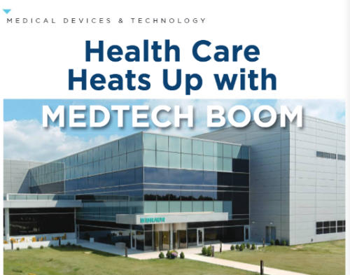 The article, “Health Care Heats Up with MedTech Boom,” leads with a photo of B. Braun’s 710,000-square-foot medical device manufacturing center in Hanover Township, Lehigh County. The company announced a $20 million expansion there that will create 200 new jobs.