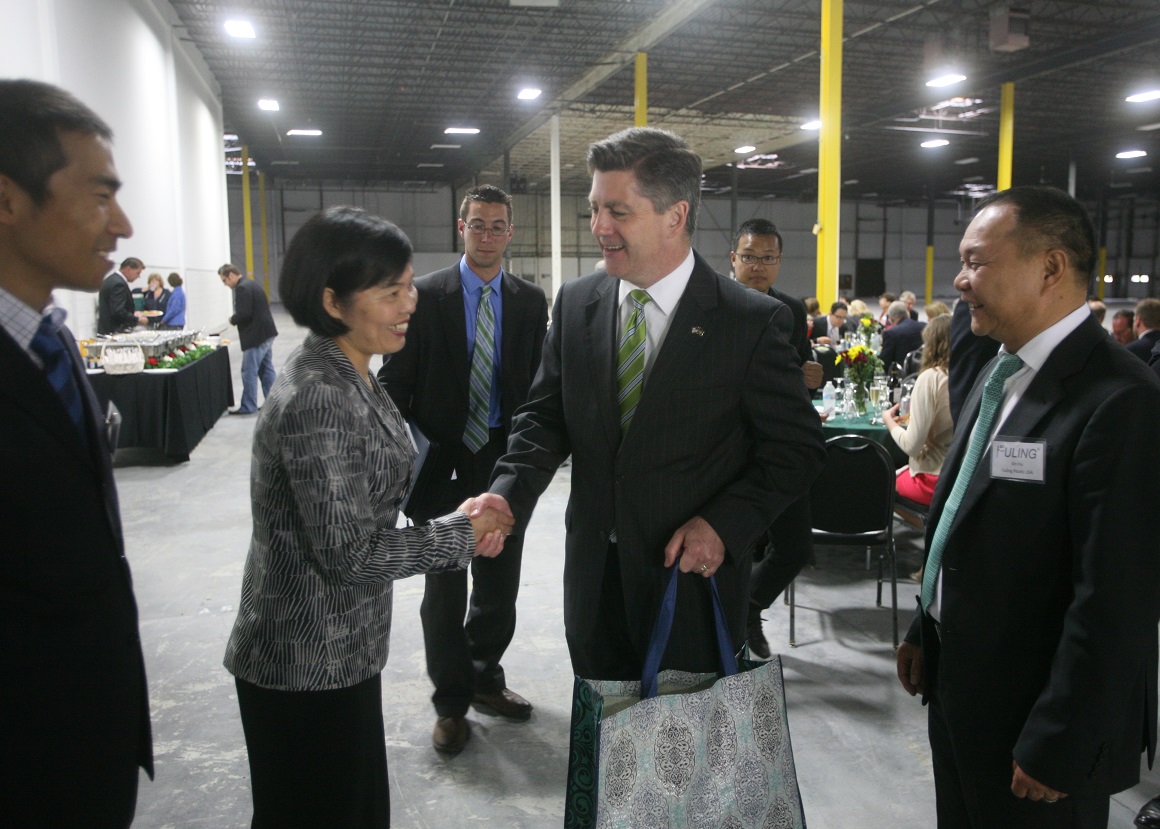 Former Pennsylvania Lt. Governor Jim Cawley (right) greating Fuling Plastic USA founder Guilan Jiang at a May 2014 groundbreaking event.She also discussed Fuling Plastic USA, which is establishing a $21.3 million facility in Upper Macungie Township, creating 75 new jobs. The American subsidiary of Taizhou Fuling Plastics Co., it is the first Chinese manufacturing company to establish a facility in the state of Pennsylvania.