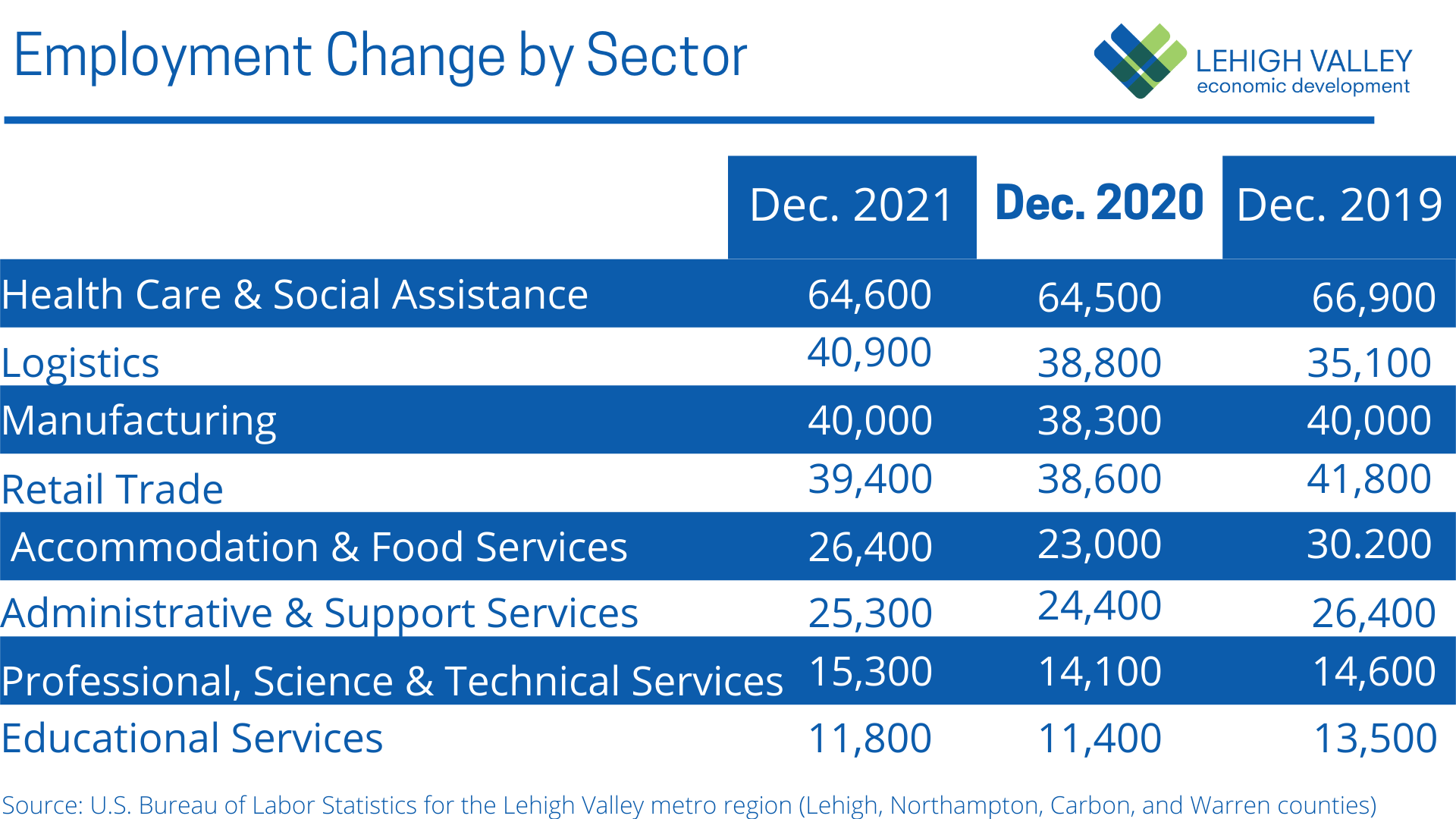 The manufacturing gains punctuate a dynamic year for the recovery in the Lehigh Valley metro region, which includes Lehigh, Northampton, Carbon, and Warren counties. The region added 11,900 jobs across all industries – the most in a single calendar year since at least 1990, the earliest local employment statistics the U.S. Bureau of Labor Statistics publishes online. Employment was up in 108 metro areas over the year and essentially unchanged in 281.Lehigh Valley's employment in December was 9,800 jobs below what it was in December 2019, according to preliminary data. Not all industries recovered at the same pace.
