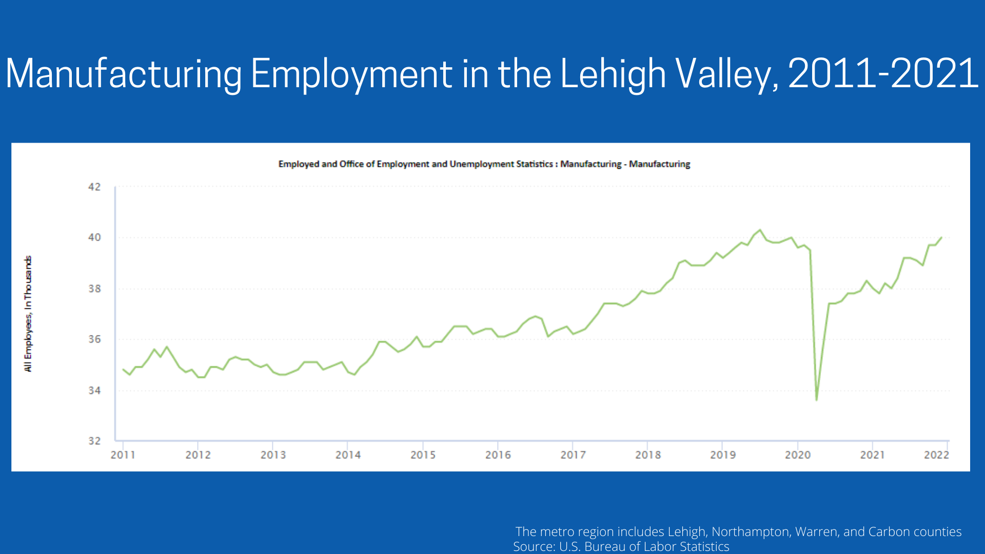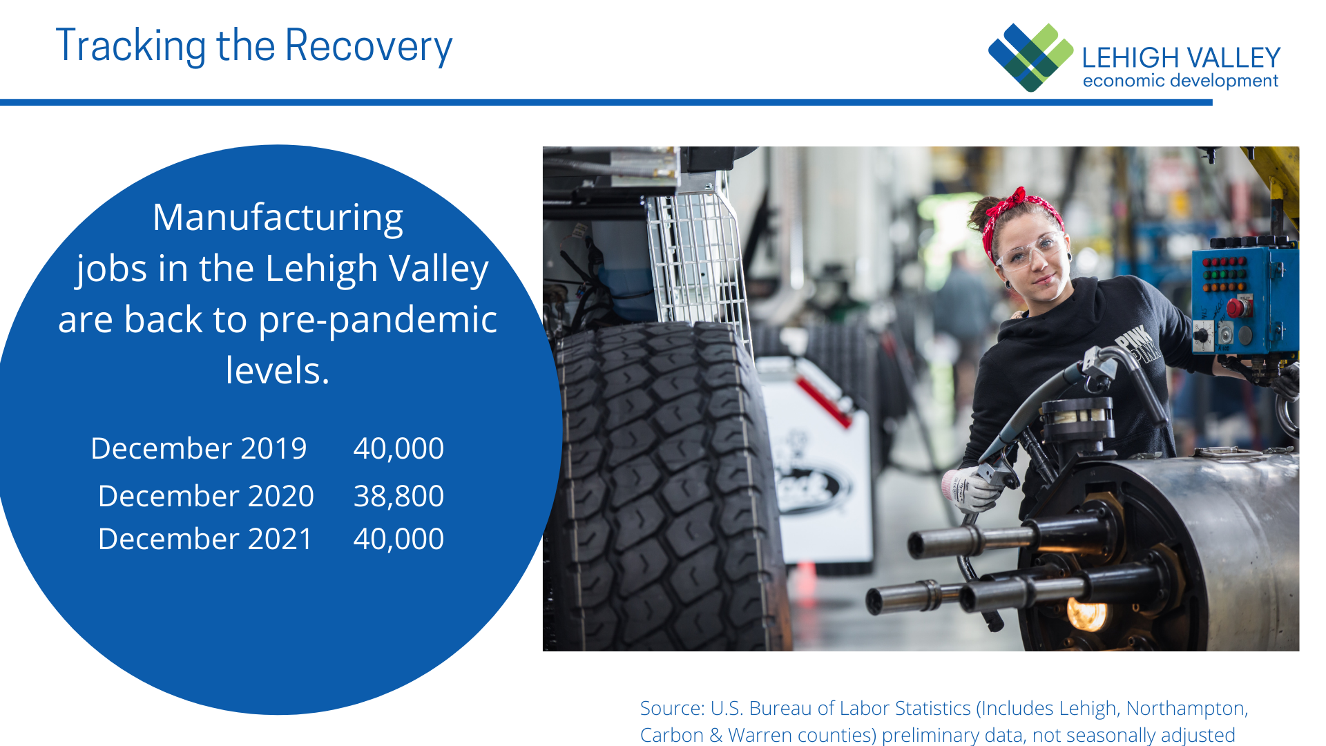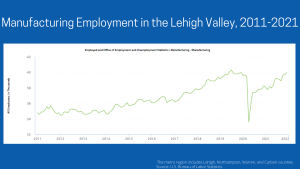 Manufacturing, one of the few sectors in the Lehigh Valley that has achieved pre-pandemic employment, has been a driving force in the Lehigh Valley’s recovery.