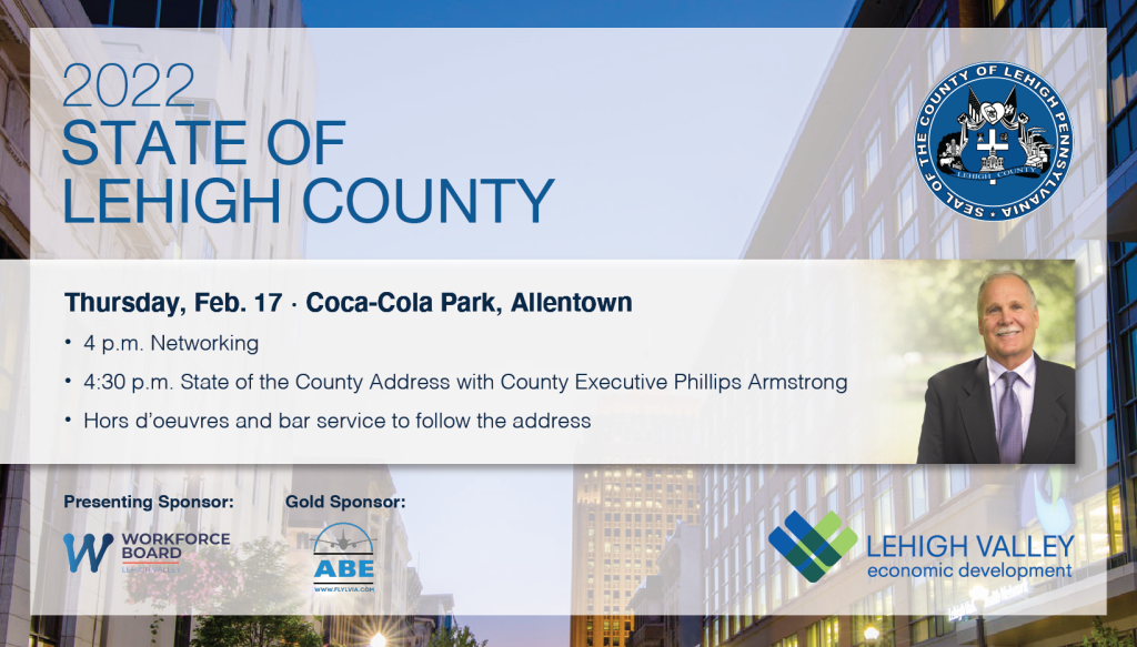 “The 2022 State of the County Address will be dedicated to the people, and show how we as their county government will work for them in the face of new and unprecedented challenges,” Armstrong said. “This is the time to share with our residents what we have in store for Lehigh County, and as County Executive, it is an honor to present these plans that will continue to shape and grow our community as we look to the future.”