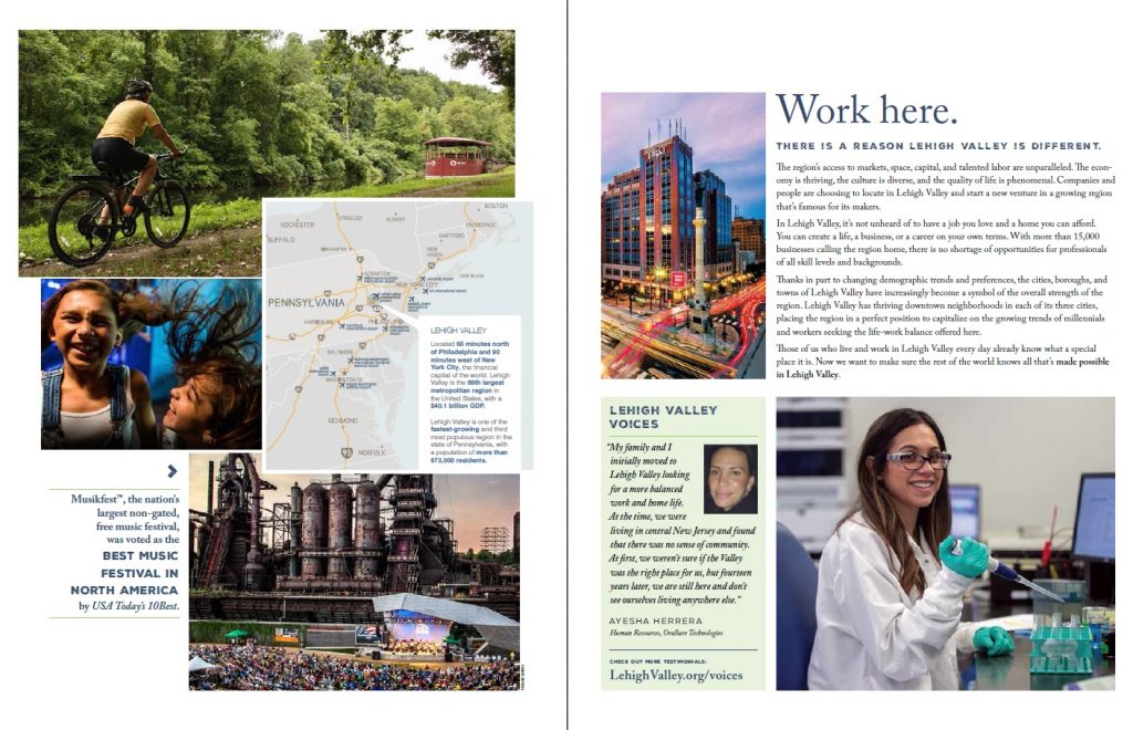 “Move here, live here, work here, play here,” the guide reads. “If there was ever a place to put down some roots or lift your spirits in the most unexpected ways, this is it. Welcome to Lehigh Valley.”