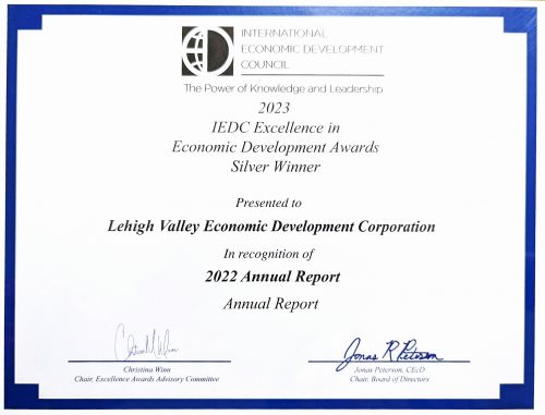 IEDC, a non-profit organization of economic development professionals, presented Silver Awards in its Excellence in Economic Development program to LVEDC’s 2022 Annual Report and the Welcome to Lehigh Valley Guidebook, a joint publication of LVEDC and Discover Lehigh Valley.