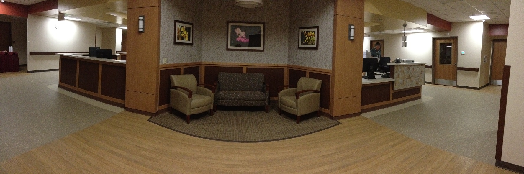 A panoramic view of Five Tower, the newly-renovated patient floor at Sacred Heart Hospital that encompasses a new patient-centered philosophy of care.Imagine a room with comfortable beds, warm colors and textures, and artwork adorning the walls. Step outside and you find multiple amenities, including lounge space, small meeting areas and a small kitchen.