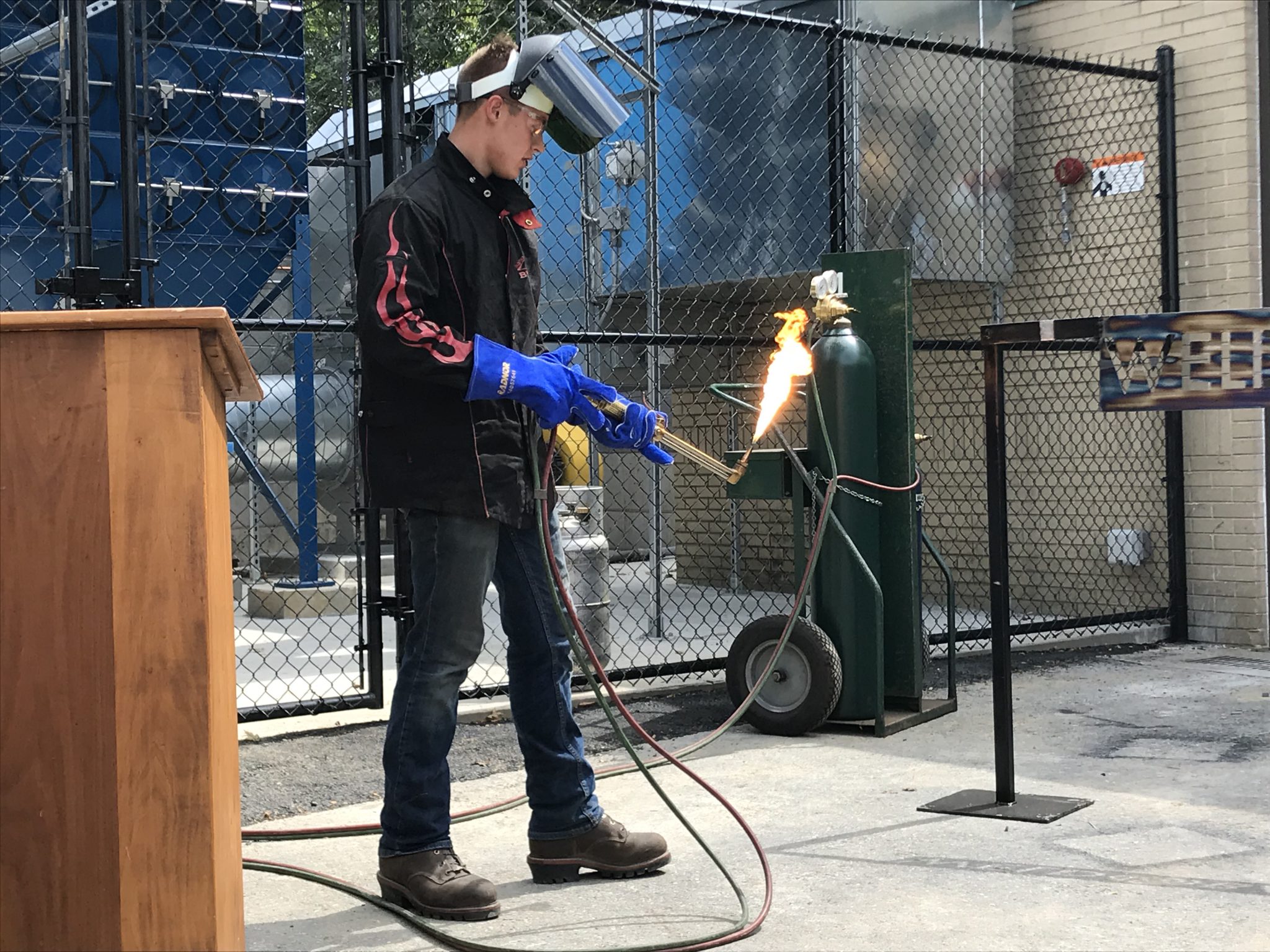 Bethlehem Area Vocational-Technical School student Nick Carr preparing the cut the steel ribbon at the welding lab grand opening.Not too many ribbon-cuttings require the use of a gas torch to get through the ribbon.