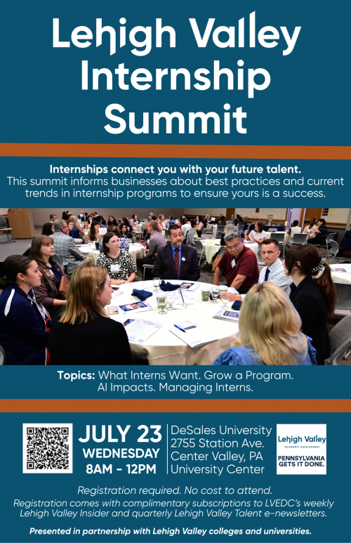 The summit, presented by Lehigh Valley Economic Development Corporation (LVEDC) in partnership with the Lehigh Valley’s colleges and universities, will be held July 23 from 8 a.m. to 12 p.m. at DeSales University.