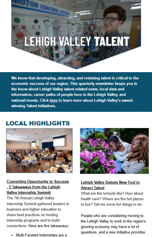 The Lehigh Valley Talent Newsletter is published quarterly by LVEDC to keep the Lehigh Valley community informed about talent-related news, local data and information, career paths, and national trends.