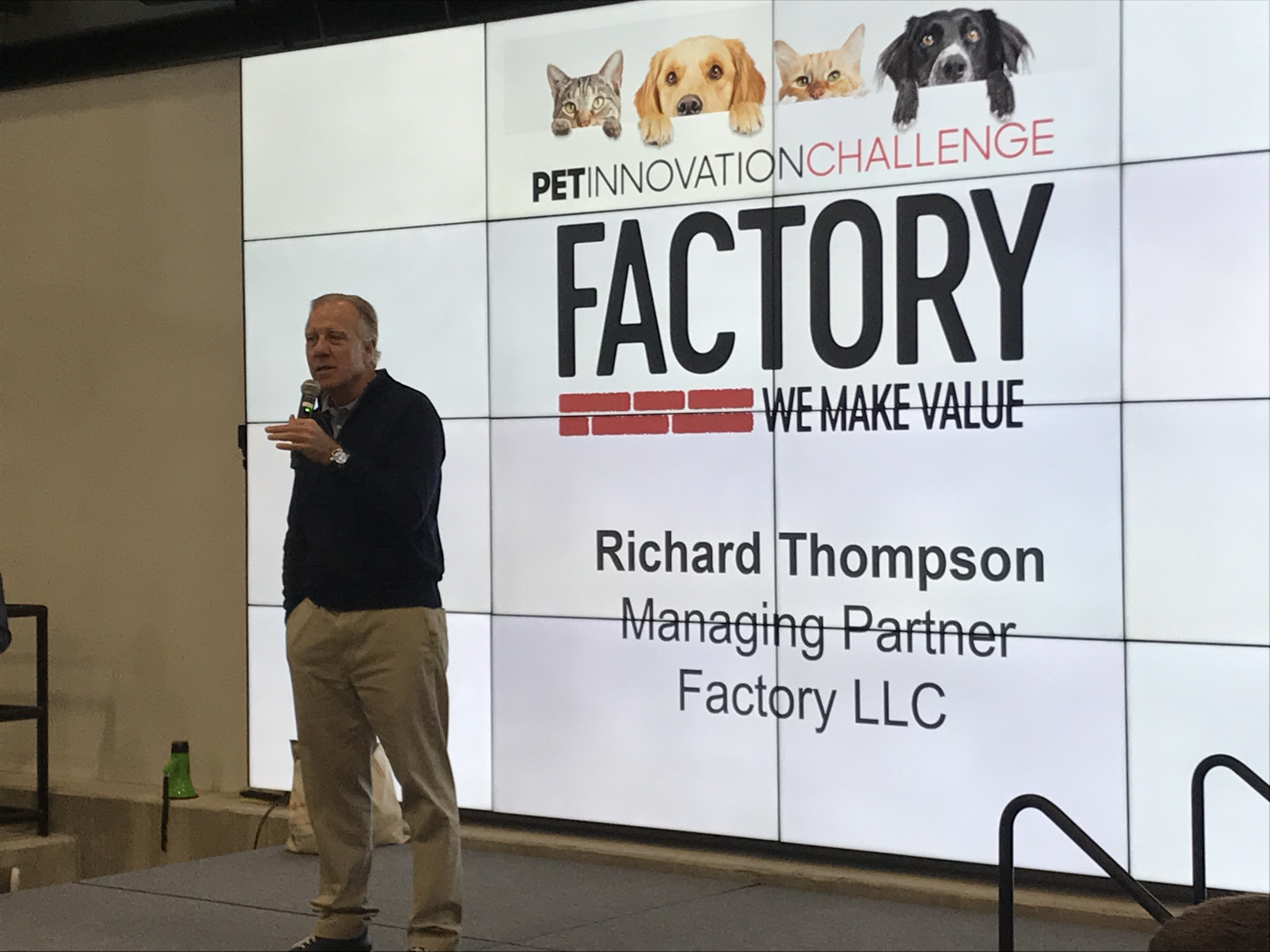 Richard Thompson, CEO of the Factory, speaking at the Pet Innovation Challenge.“We help these companies grow and expand and move down the road,” Thompson said. “The idea is that they come in for 12 or 24 months, we get strategic partners and scale them up to a certain level, then we exit them out.”